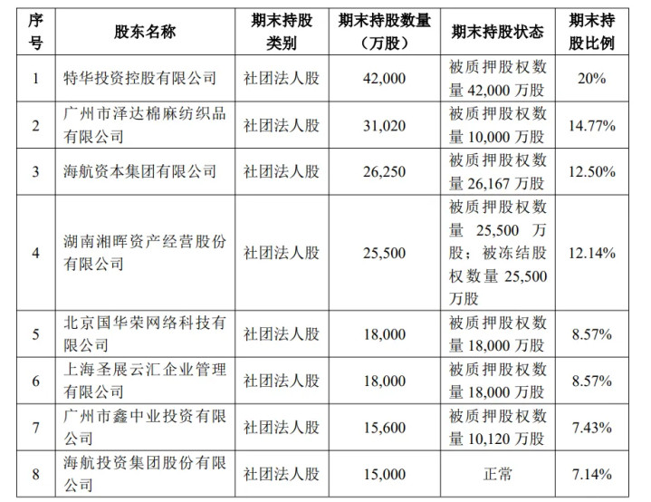据华安财险2025年4季度偿付能力报告摘要披露,该公司11名股东质押持有的该公司股份数量合计16.13亿股,占该公司总股本的比例为76.83%。其中,该公司第一大股东特华投资控股有限公司(简称“特华投资”)、第四大股东湖南湘晖、第五大股东北京国华荣、第六大股东上海圣展、第十大股东深圳市深信创业投资有限公司、第十一大股东广州利迪经贸有限公司的股权质押比例均触顶100%,该公司第三大股东海航资本集团的股权质押比例也高达99.68%。
