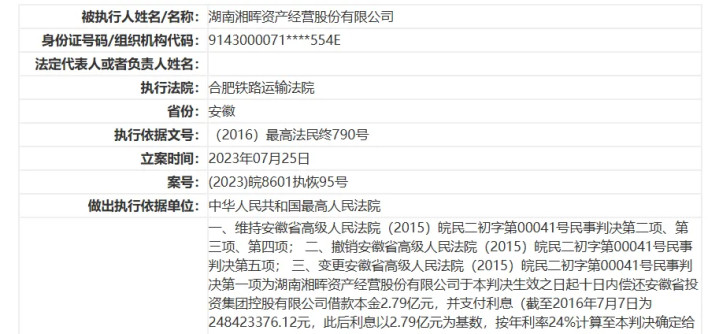 除3家大股东出现非标违约外,华安财险第四大股东湖南湘晖资产经营股份有限公司(简称“湖南湘晖”)还沦为失信被执行人。该公司失信被执行人行为具体情形为“其他规避执行”,涉案金额2.79亿元,被执行人的履行情况为“全部未履行”,立案时间为2023年7月25日。