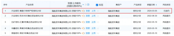 据企业预警通提供的信息显示,粤晓13号财产权信托成立于2018年6月8日,信托期限12个月,海航资本集团将其合法持有的标的股权收益权转让给兴业信托设立财产权信托,对应信托财产投资资金总额为50000万元,获得的信托对价用于补充企业经营性资金。 2023年12月,兴业信托收到海航集团破产重整专项服务信托分配资金40.64万元,因该笔资金收入未能足额支付信托费用,故无可分配信托收益。