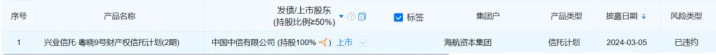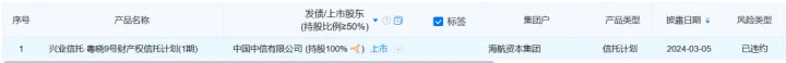 企业预警通显示,粤晓9号财产权信托1期成立于2018年2月6日,信托期限12个月,北京国华荣将其合法持有的标的股权收益权转让给兴业信托设立财产权信托,对应信托财产投资资金总额为15000万元,获得的信托对价用于补充企业经营性资金。2023年12月,兴业信托收到海航集团破产重整专项服务信托分配资金25.14万元,因该笔资金收入未能足额支付信托费用,故无可分配信托收益。