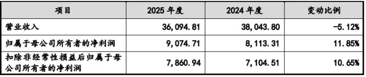2025年,公司实现营业收入3.61亿元,同比减少5.12%,归母净利润为9074.71万元,同比增长11.85%,形成“增利不增收”的背离态势。2026年一季度,公司预计营业收入约为9010万元至9959万元,同比变化-4.74%至5.30%;归母净利润约为2260万元至2400万元,同比上升0.09%至6.29%。